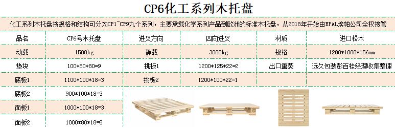 标准化是实现托盘联运的前提,是实现物流机械和设施标准化的基础,也是产品包装标准化的依据。标准化的木托盘可以将形状规格不一的货物装载在标准规格的木托盘上,使货物标准化的进行运输以及各种作业,极大的提高了物流运输的效率,也方便机械的自动化搬运等。 欧标托盘系列CP 6号化工木托盘是一款标准的化工产品专用的木托盘,规格是:1200*1000*156㎜,有严格的加工制作标准,采用20块优质松木板材、9块实木或合成垫块、84颗优质螺纹托盘专用钉严格按照CP托盘技术规范生产。是CP系列化工木托盘之一。CP 6号化工木托盘的制造秉承可循环理念,使用对环境的二氧化碳减排有益的木材制造,成品可以被维修、被再利用。 欧标系列CP6号化工木托盘的材料尺寸如下: ◆ 面板(两边与中间):1000×100×18=3块,1000×80×18=8块; ◆ 跳板:1200×125×22=2块,1200×100×22=1块; ◆ 脚墩:80×80×100=9块; ◆ 底板(竖着):1100×100×18=3块; ◆ 底板(横着):900×100×18=3块; 欧标系列CP 6号化工木托盘参数: ◆ 规格:1200*1000*156㎜; ◆ 自重:25±0.5kg; ◆ 载重:均匀负载动载1500kg,静载3000kg; ◆ 材料:符合欧标托盘制作标准的20块优质松木板材、9块实木或合成垫块、84颗优质螺纹托盘专用钉组装而成; ◆ 工艺:按欧标托盘技术规范制作,与所有(传统的)标准物流装载工具、工业卡车和仓储系统兼容,主要用于运输袋装货物、纸箱和其他类型箱。